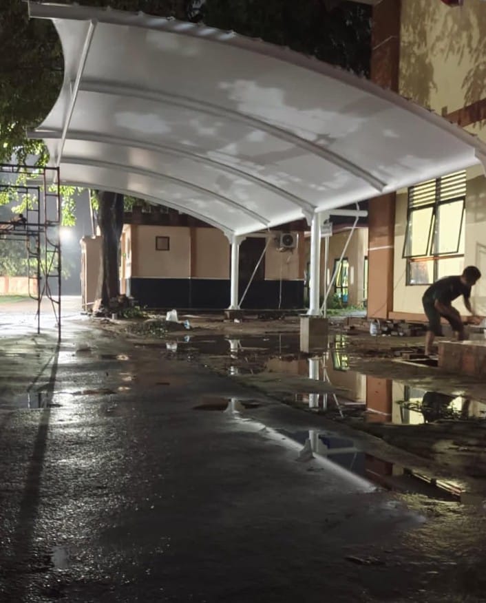 Foto-foto berikut merupakan dokumentasi asli dari proses produksi dan pemasangan canopy oleh tim Srijaya Canopy.